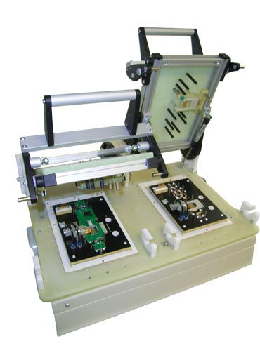 The new adapter change system HC 30 / 200 Tandem is used to insert and remove exchange kits for testing assembled printed circuit boards.